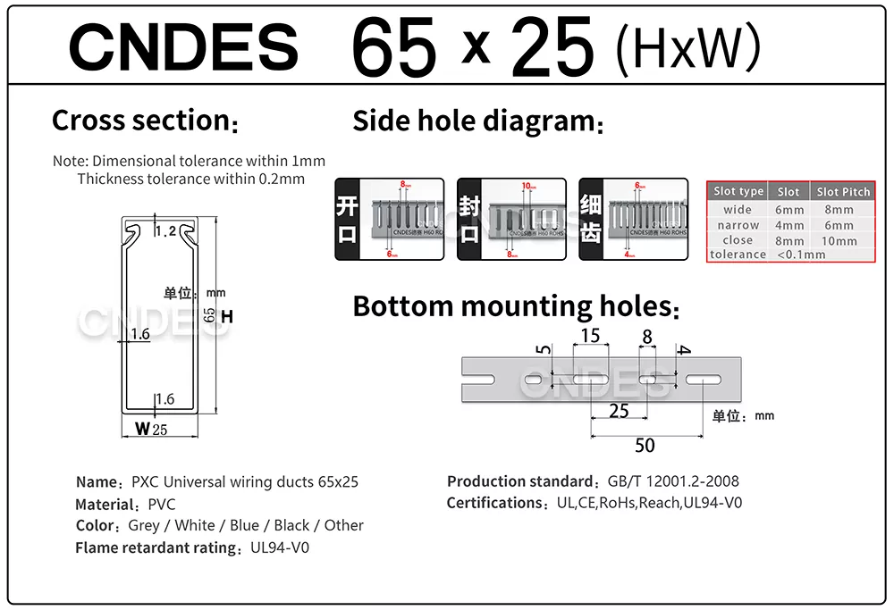 Les conduits de chemins de câbles personnalisés 65 × 25 du CNDES sont un canal de gestion des câbles à profil mince en PVC rigide. Il est principalement utilisé pour guider et protéger les câbles dans les zones où :