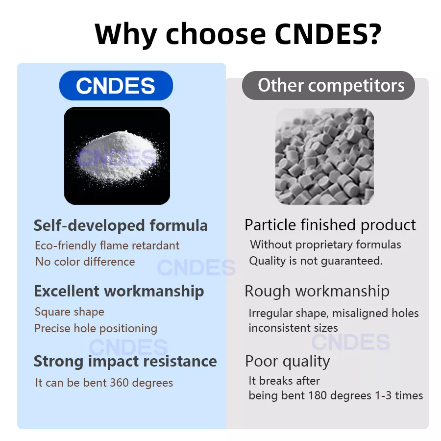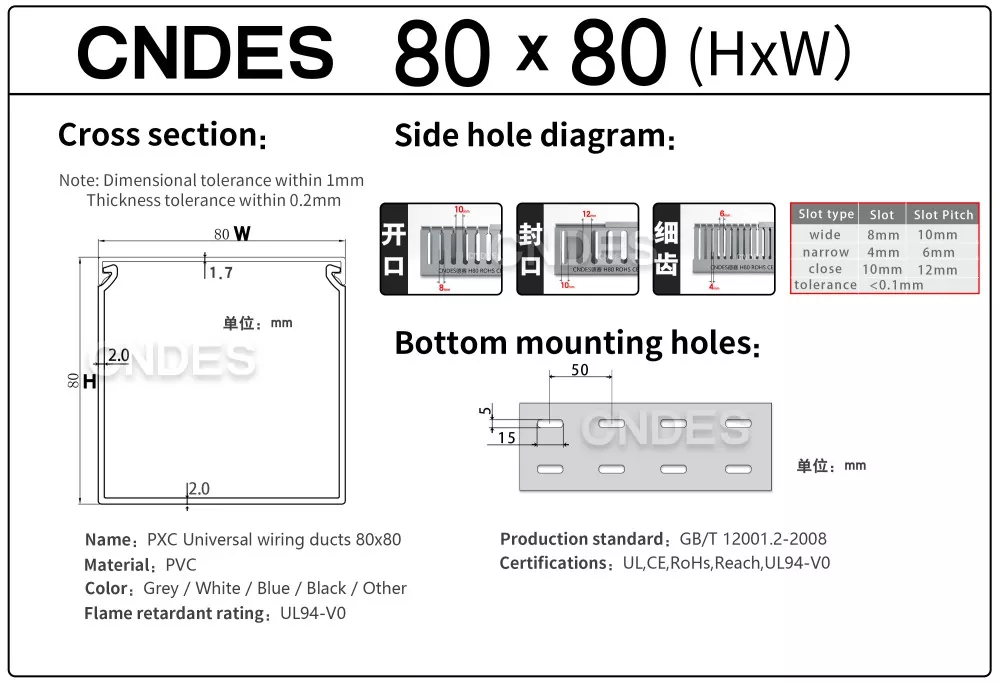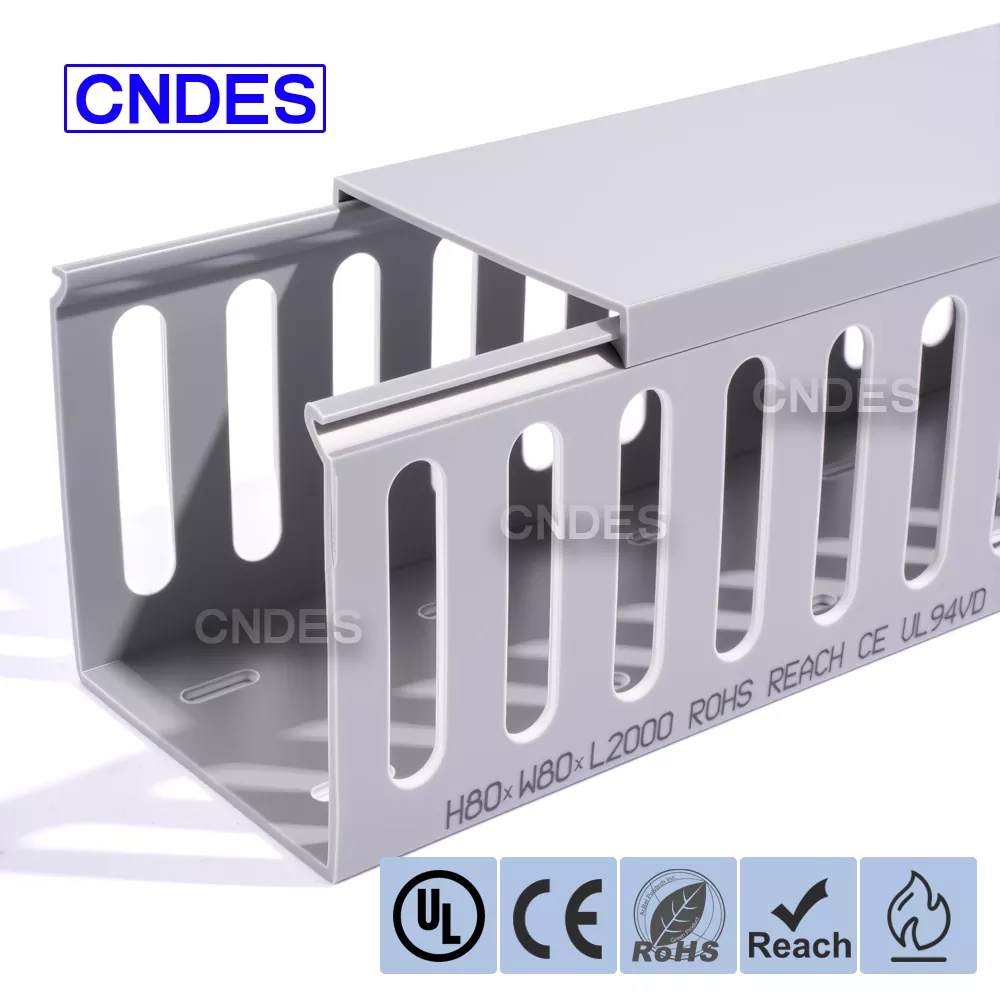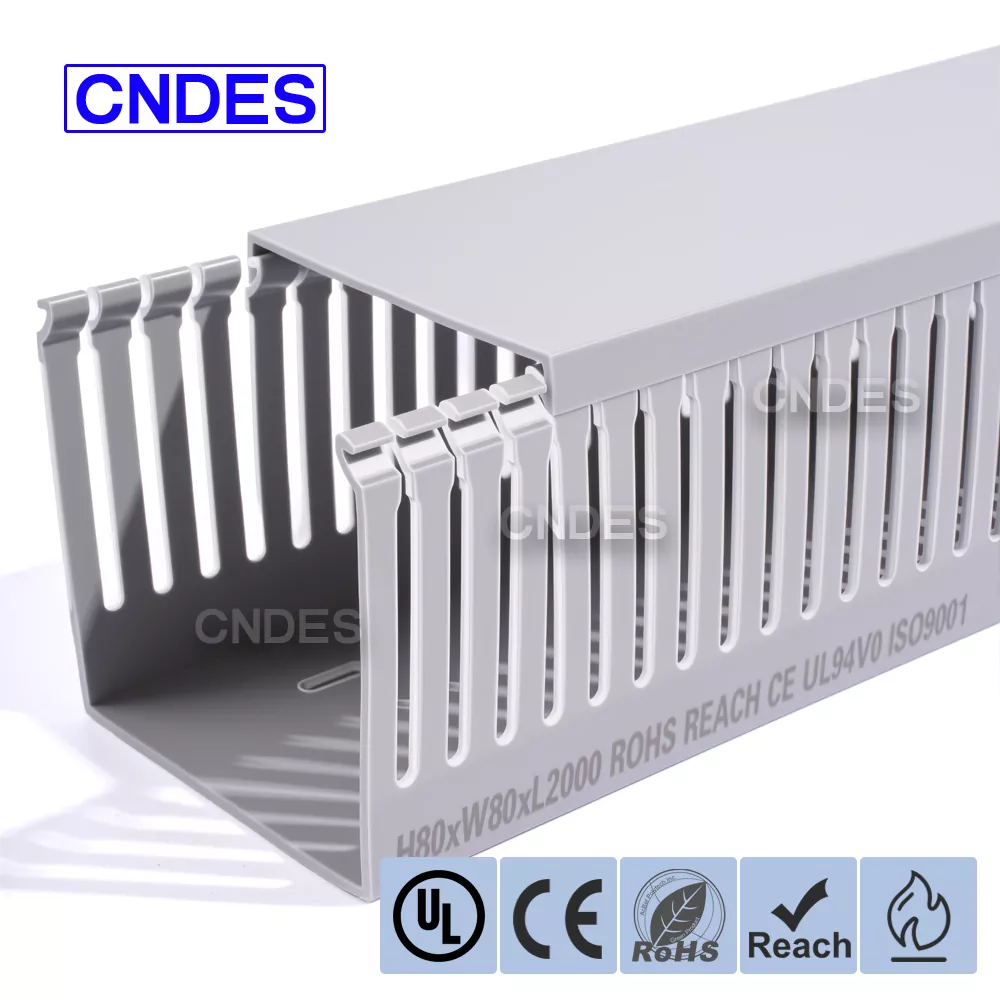 Lorsque les chemins de câbles standard ne parviennent pas à accueillir des faisceaux de câbles complexes, la goulotte de câblage pour tableau de distribution en PVC à fente 80 × 80 personnalisée CNDES est votre bon choix. Avec un grand espace interne de 80 mm x 80 mm, il est spécialement conçu pour les scénarios à forte demande tels que le câblage de base du centre de données, les clusters d'alimentation d'équipements industriels et le câblage centralisé dans les grandes armoires de commande. Il accueille et organise facilement un grand nombre de câbles, disant adieu une fois pour toutes à l'encombrement et à l'encombrement.