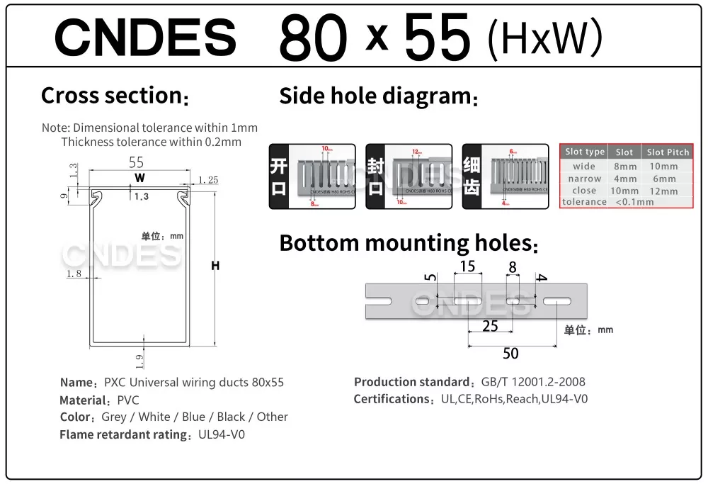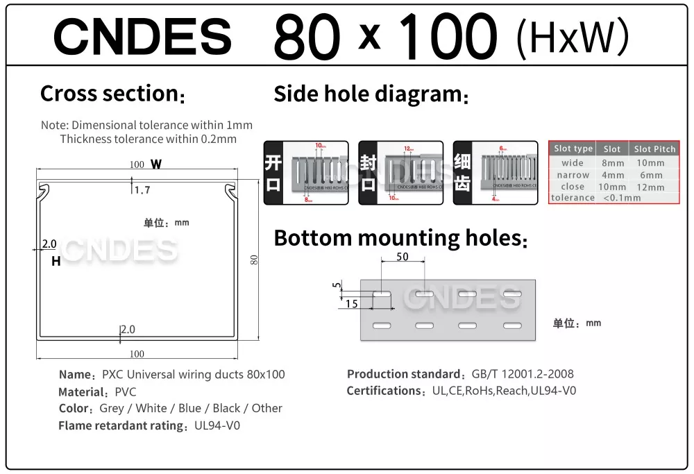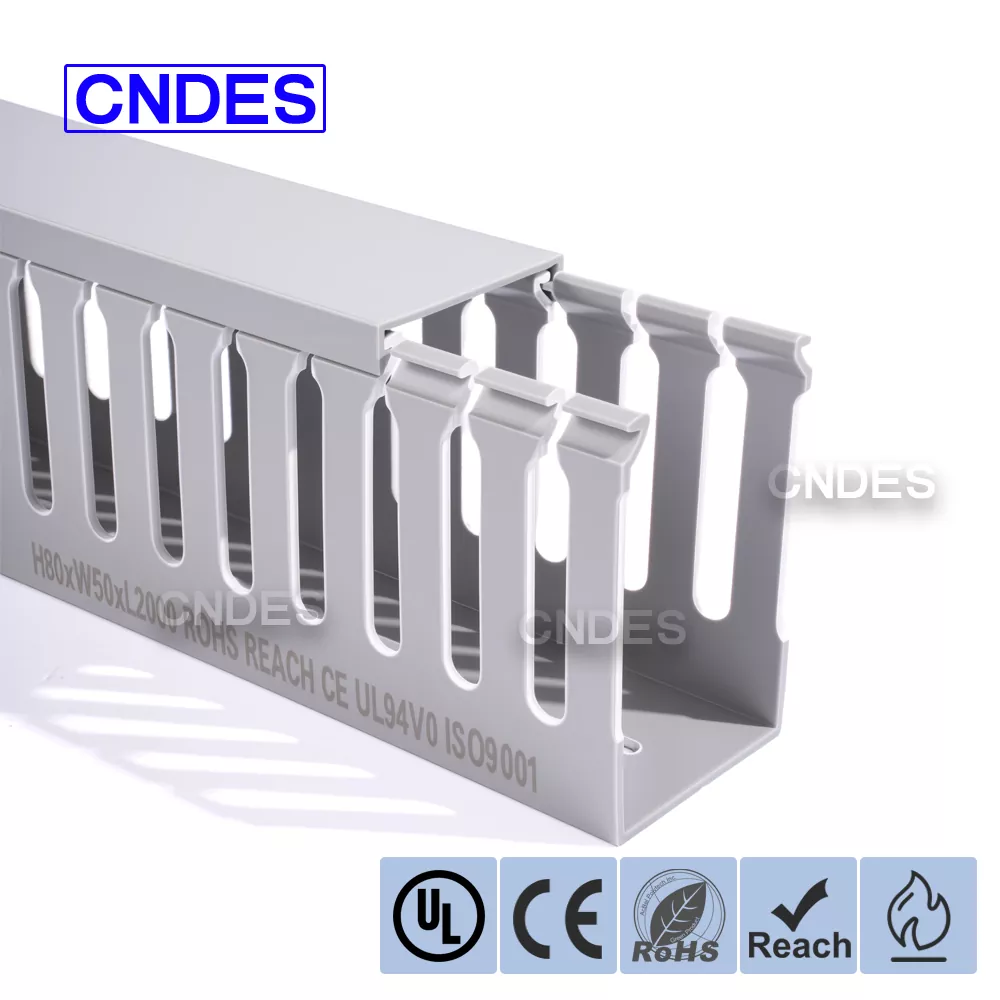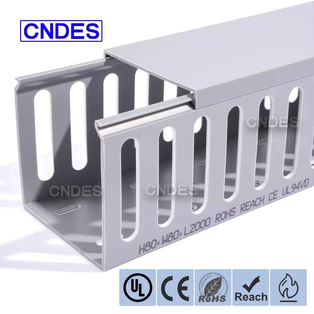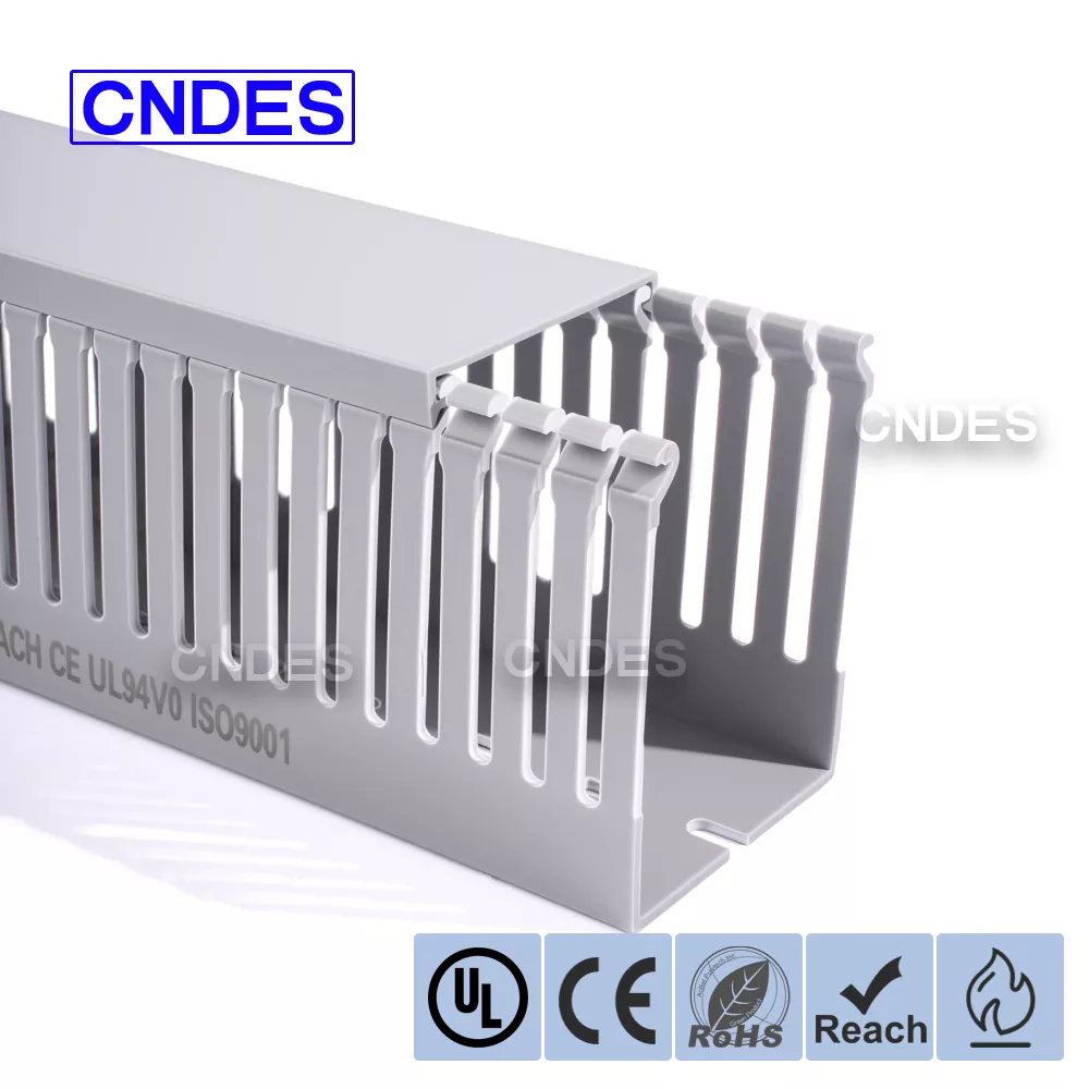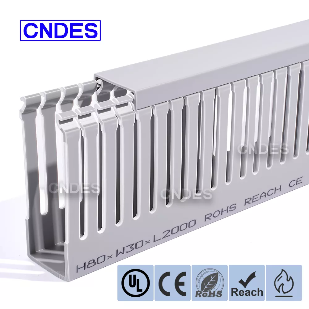 Le conduit de câbles d'automatisation en PVC à fente personnalisé de 80 hauteurs de CNDES est conçu pour une gestion efficace des câbles dans les systèmes d'automatisation industrielle. Avec sa hauteur de 80 mm et sa conception à fentes, ce conduit offre suffisamment d'espace pour un câblage haute densité tout en gardant les câbles organisés et protégés dans les systèmes de contrôle complexes, les automates et les applications de câblage de machines.