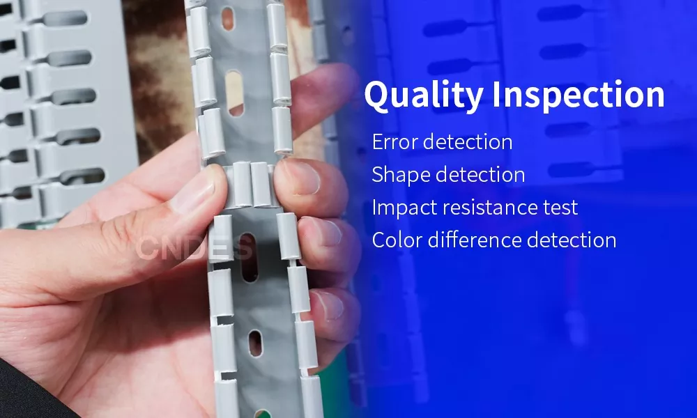 Un contrôle de qualité de haut niveau est essentiel pour fournir de bons produits. Au CNDES, notre quête de qualité est sans fin. Nous ne ménageons aucun effort pour fournir à nos clients des produits fiables. Nous avons quatre inspecteurs de qualité qui travaillent par équipes pour effectuer des inspections en ligne de nos produits. Cela garantit que nos goulottes de câbles d'automatisation en PVC à fente de qualité 80 hauteur sont de forme carrée, ont des surfaces lisses, répondent aux normes de ténacité acceptables,